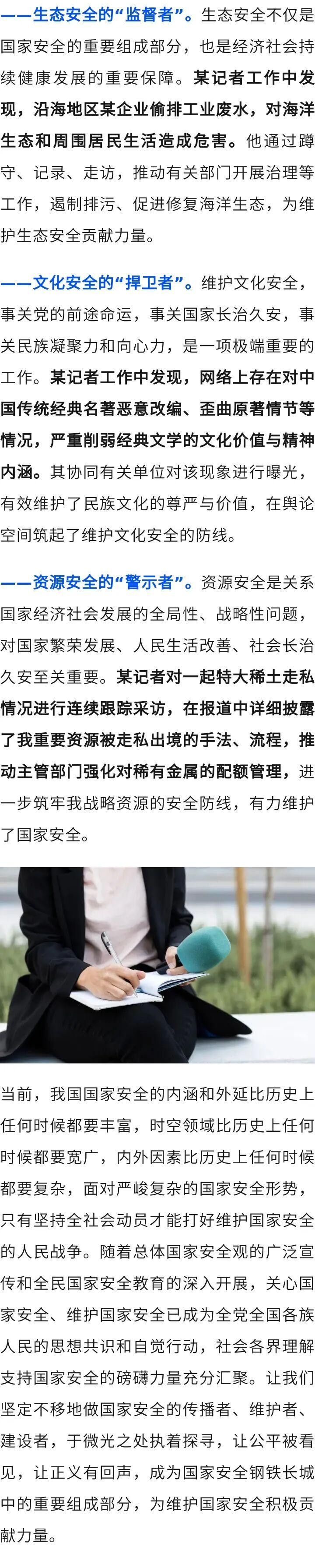 12月13日,“国家安全部”微信公众号发文表示,在信息爆炸的时代,国家安全的防线早已突破传统疆域,覆盖到舆论引导、真相揭露、民生福祉的每一个角落。作为时代的记录者、勇毅的发声者,一批优秀的中国记者或间接或隐蔽地为国家安全筑起一道无形屏障,将国家安全的防线延伸到笔锋流转与光影记录之中。